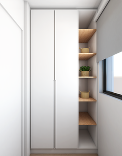 A suíte do apartamento possui um closet de conceito aberto com uma ilha de apoio. A iluminação indireta do painel de televisão e da cabeceira ripada trazem um maior aconchego ao ambiente. No banheiro, foi usada uma textura marmorizada nos revestimentos e pontos verdes na decoração. Já o outro quarto foi projetado para uma adolescente. Os pontos de rosa suave na marcenaria do ambiente, aliados ao metais dourados, trazem delicadeza e feminilidade. O banheiro que atende ao quarto segue a mesma linguagem delicada, trazendo uma textura marmorizada e o rosa para retomar a feminilidade.